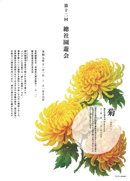 11月1日から16日まで『總社園遊会』を開催いたします。『總社園遊会』とは菊花の展示に合わせて、期間中に様々な参加型の催しを行うものです。今年もぜひお申込みをお待ちしております。