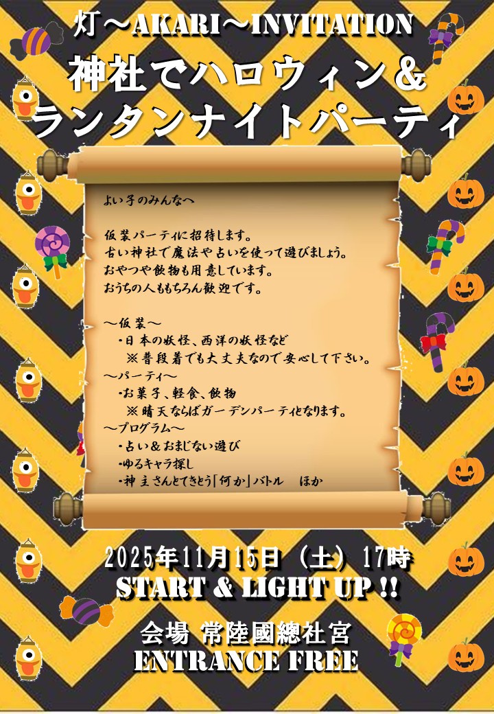 常陸國總社宮ではハロウィンの根源的な意味を踏まえ、人類に共通する祈りの気持ちを、楽しいパーティ形式で学び、楽しみたいと考えています。